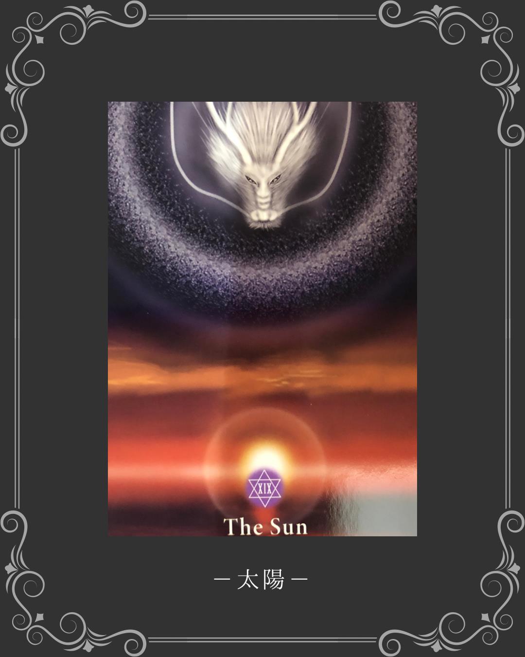 太陽、それは大地すべてを照らすまばゆい光。今、汝の中にある、すべてのものに陽の光をあてるときが来た。輝く太陽となりて、人々の導き手となるのだ。暗い夜は明け、陽は昇り、汝の人生が輝きだす。人々の導き手となる汝は、多くの恩恵を受け取るであろう。太陽となるがゆえの挑戦もあり、人々の投影となり、矢を受けることもあるであろう。けれど、成長するための努力をいとわず楽しみなさい。太陽のまばゆい光は、すべてを成長させ明るく照らす存在。汝の誠実さは、すべてを照らす太陽のごとく、多くの人々に光をもたらす存在になる🐉✨